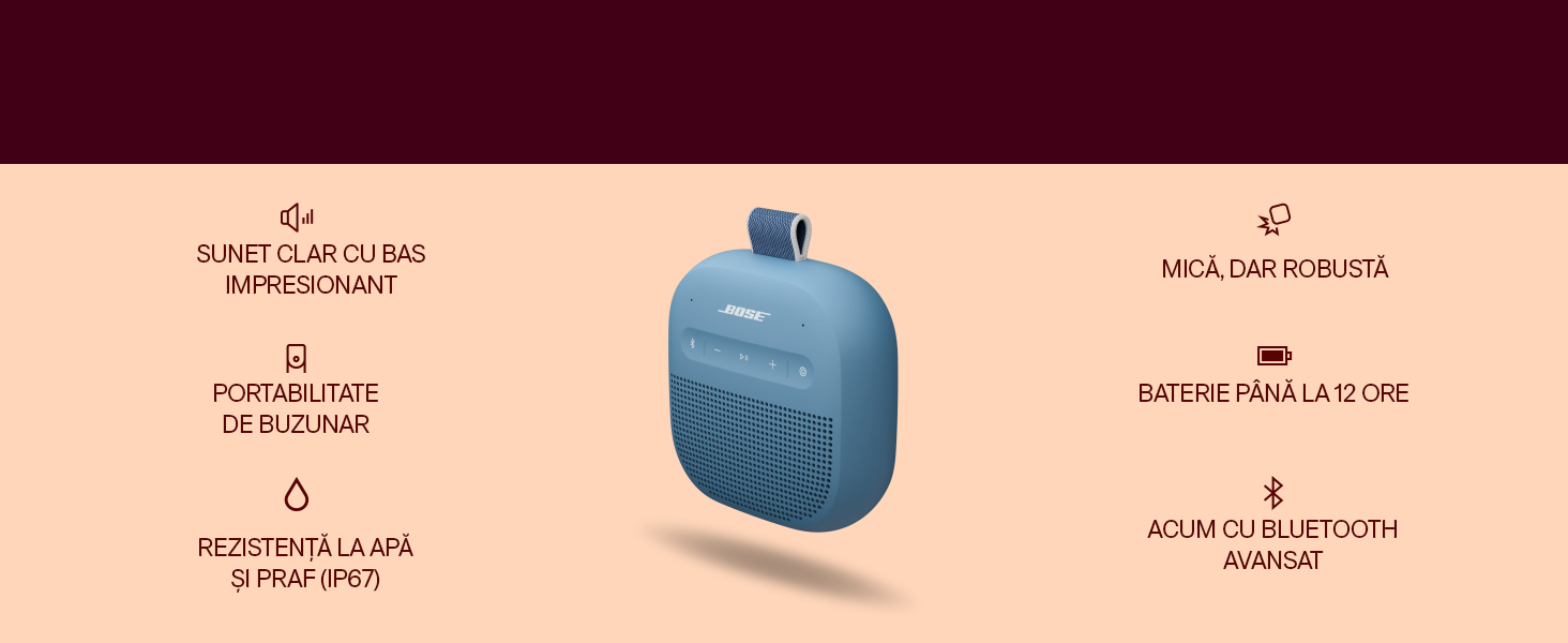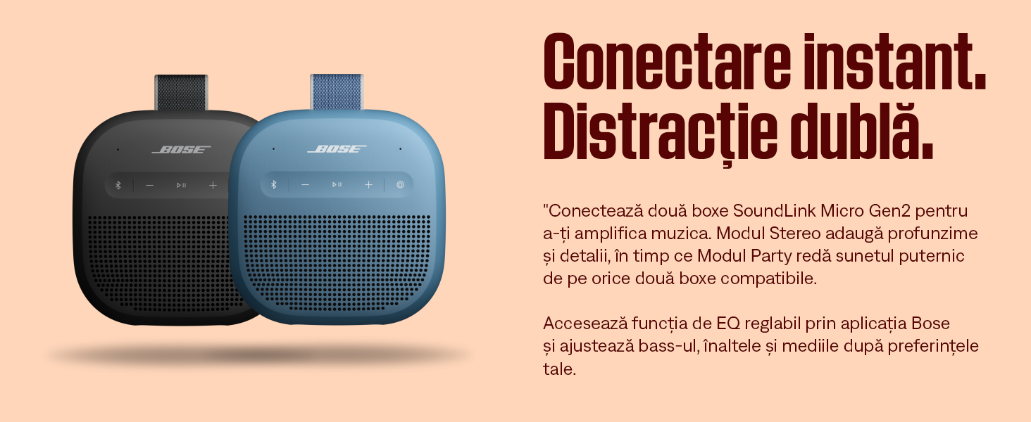 Pornește conexiunea cu noul și mai bun ca niciodată SoundLink Micro (a 2-a generație). Suprinzător de mică, această boxă portabilă încape în palmă, dar poate reda până la 12 ore de sunet clar. Această boxă minusculă, dar rezistentă, redă muzică indiferent de vreme și este suficient de puternică pentru a sparge liniștea, oriunde.