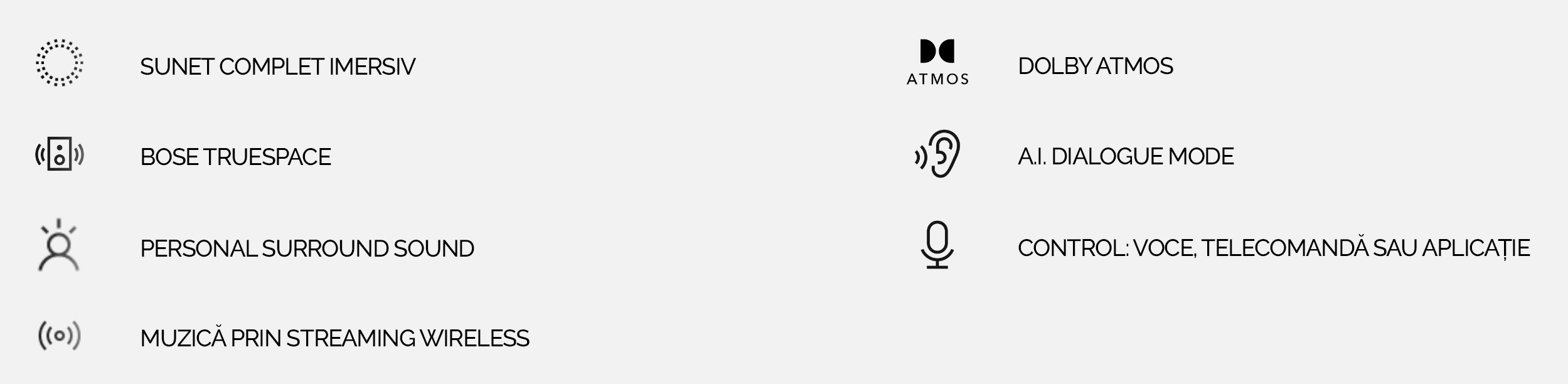 ² Personal Surround Sound: Conectați Bose Ultra Open Earbuds (vândute separat) prin SimpleSync pentru Personal Surround Sound. Acționând ca difuzoare surround de spate pentru utilizatorul individual, acestea combină un design unic open-ear cu tehnologia revoluționară Bose Immersive Audio pentru a adăuga profunzime experienței audio oferite de soundbar-ul dumneavoastră.