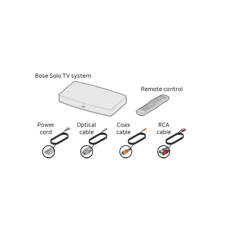 Articole în cutie Sistemul Bose® Solo TV; Telecomanda (cu baterii); Cablu de alimentare; Cablu audio digital optic; Cablu audio digital coaxial; Cablu audio analogic stereo; CD demonstrativ
