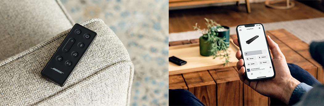 - Remote: power, volume, mute, source buttons (TV, Bluetooth, Bose app), play/pause
