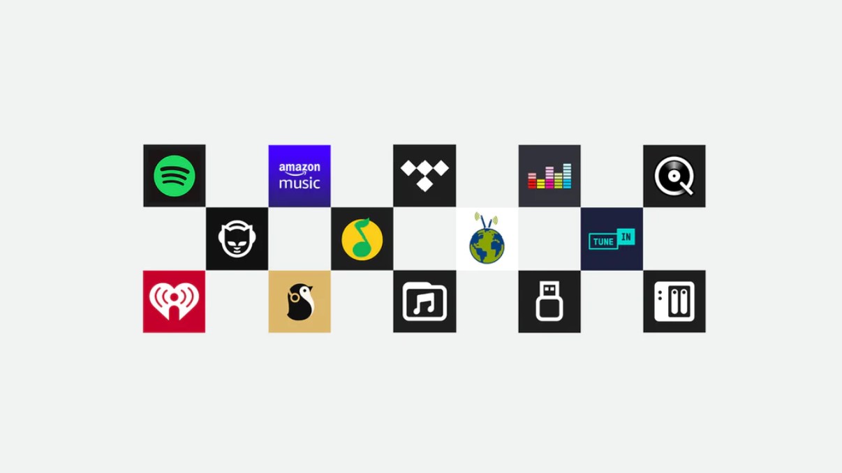 Spotify, Amazon Music, Tidal, Qobuz, Deezer, Napster, TuneIn, Internet Radio, iHeart Radio, QQ Music, QQ FM.